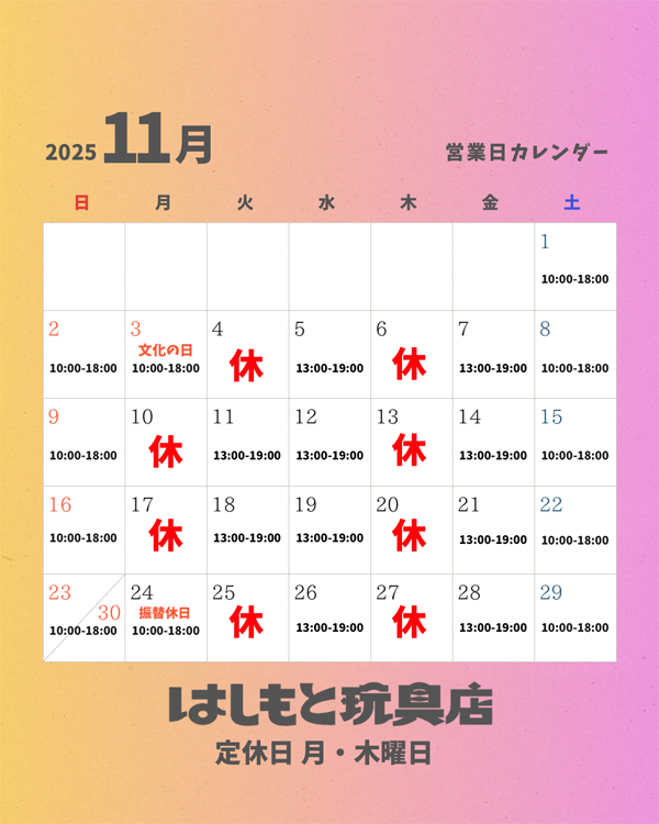 ★11月24日(月)振替休日 祝日営業 10:00~18:00