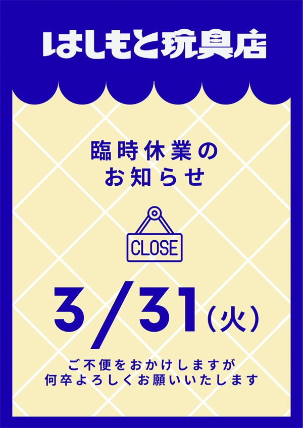 臨時休業(3月31日)のお知らせ